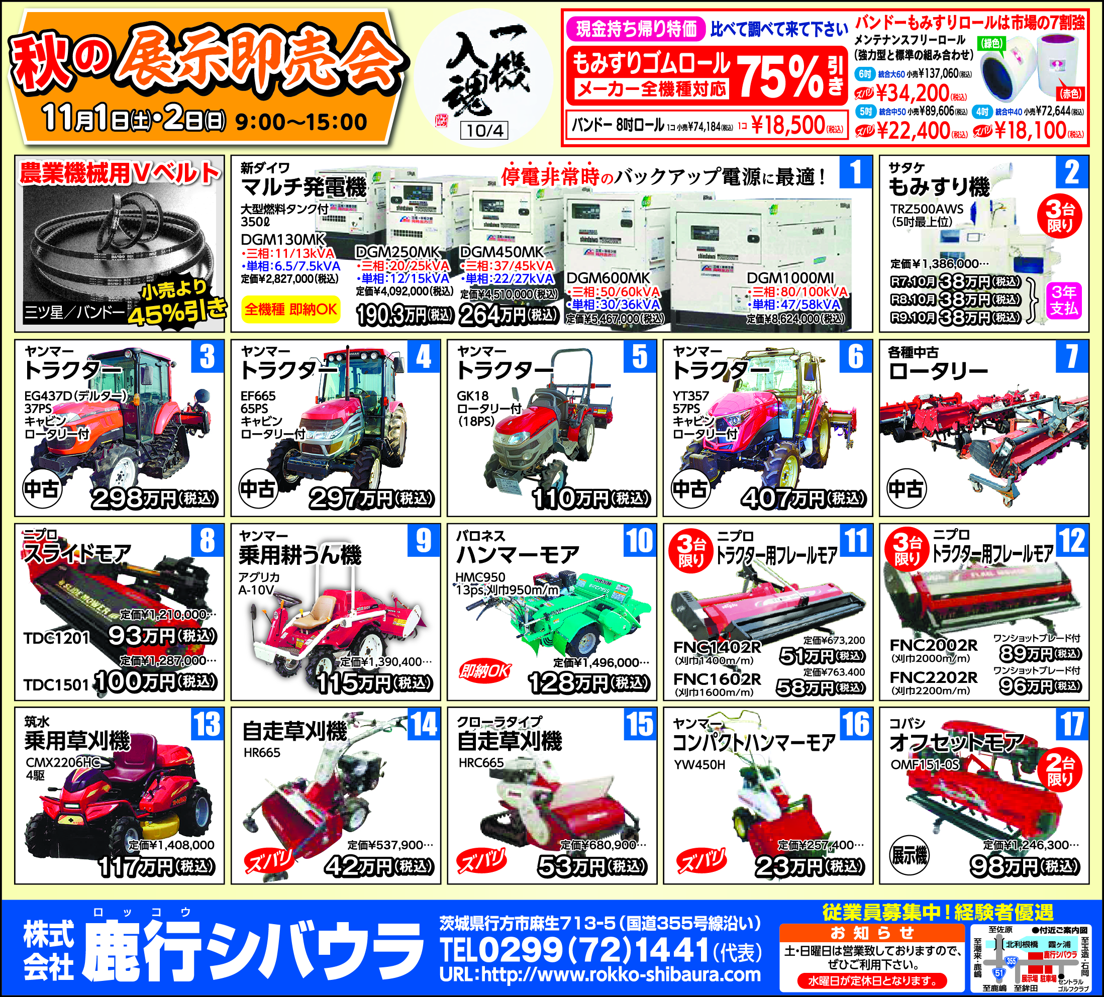 11月1㈯・2㈰ 秋の展示即売会 会場:㈱鹿行シバウラにて行います。皆様のご来場お待ちしています(^^)/